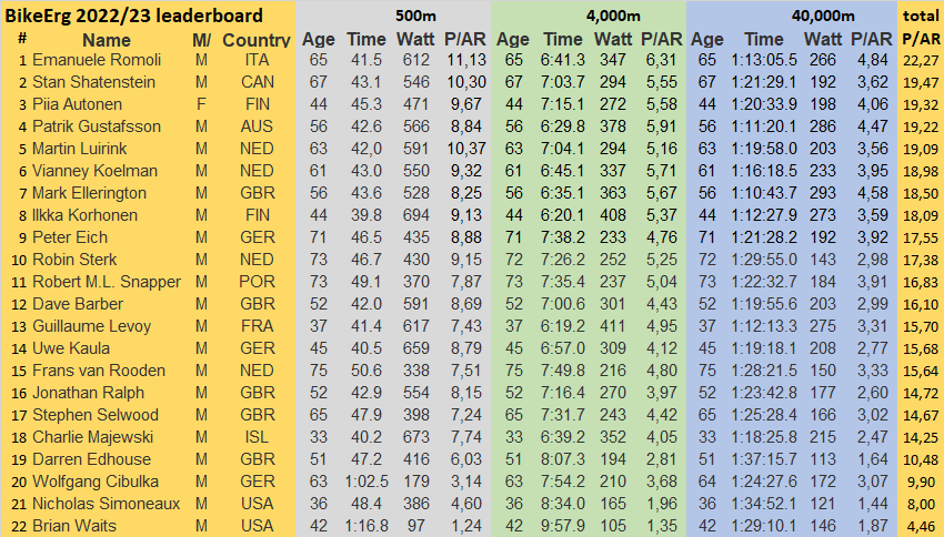 Are you a BikeErg enthusiast? And keen to know how you stack up against others over the various distances? Welcome to the BikeErg all-rounders leaderboard! No registration is needed. Once you have upload C2 BikeErg verified results for the 500m, 4k and 40k event to the ranked results in your Concept2 logbook, you are participating in this leaderboard. And each time you upload an improved (ranked and verified) result for any of these three distances, your leaderboard score will improve with it. Till end of erg season (till April 30th) you can make as many attempt as you wish to improve your score.